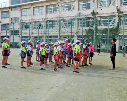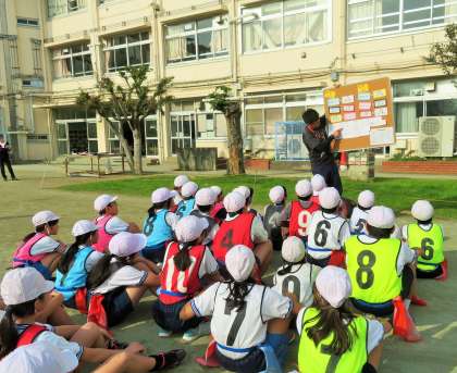 先日、6年3組内野先生が指導する「フラッグフットボール」の授業について、世田谷区教育委員会指導主事の先生を講師にお招きし、研究会を行いました。
