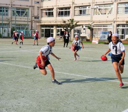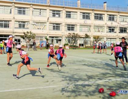 「フラッグフットボール」とは、アメリカンフットボールのルールを小学生の力にあわせてアレンジしたスポーツです。タックルの代わりに、腰につけたフラッグをとられるとアウトです。ボールはアメフトで使うボールのミニ版です。