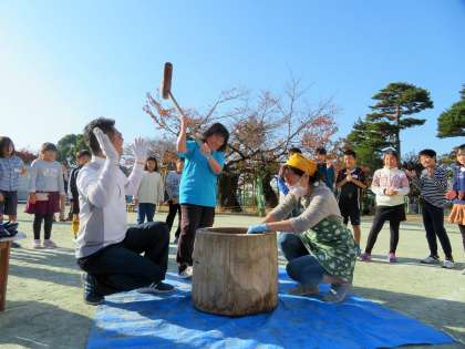 先生も一緒になってのもちつきです。