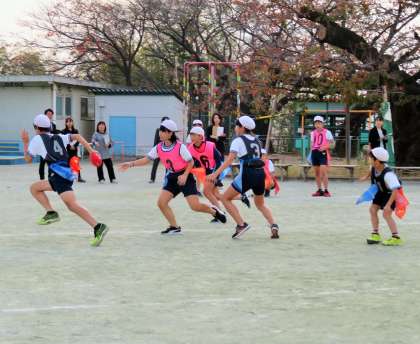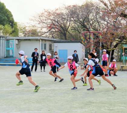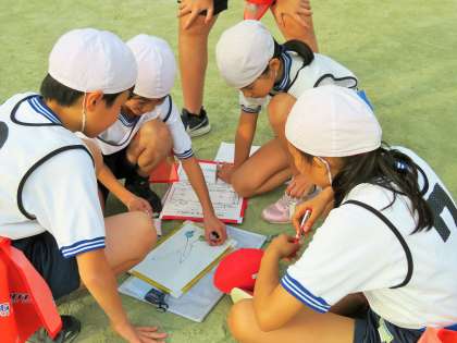 作戦会議後に後半のゲーム開始です。校庭には、いろいろな表情がいっぱいですが、特に「ボールを持たないときの動き」に焦点を当てて、上手く仲間をサポートできたときの楽しさを味わわせたいという授業になっていました。