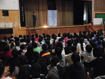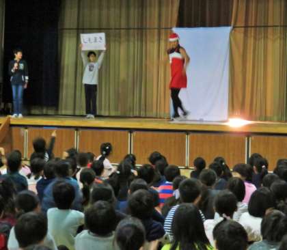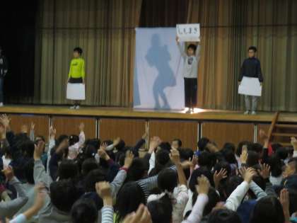今日の児童集会は、集会委員会による「先生当てシルエットクイズ」です。いろいろな姿に扮した先生のシルエットやヒントから、どの先生かを当てるクイズです。ヒントは3つで三択問題です。