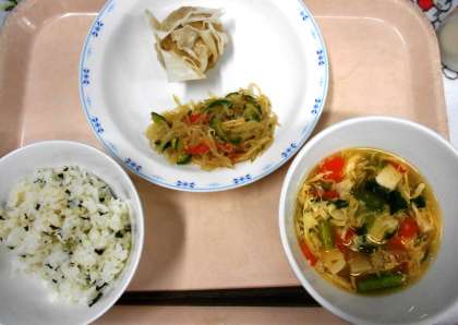 今日の主菜は、<ジャンボシュウマイ>です。シュウマイは中国の料理で、ひき肉や野菜をあわせて練ったものをシュウマイの皮で包み、蒸して作ります。砧小では、11cmの皮と13cmの皮を使用いたしました。子どもたちには、ジャンボ餃子の方が人気があるようですが、今日のシュウマイももりもり食べていた学級が多く、安心しました。
