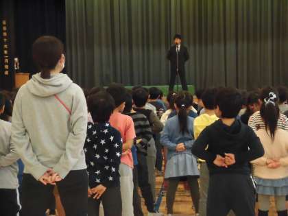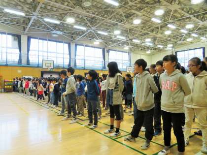 今日の全校朝会は、世田谷子ども駅伝(学び舎対抗の駅伝)の話をしました。砧の学び舎チームは、砧中学校の1・2年生と、砧小学校、明正小学校、山野小学校から5・6年生の希望者が、朝、7時20分から合同で18回の練習を積み重ねてきました。