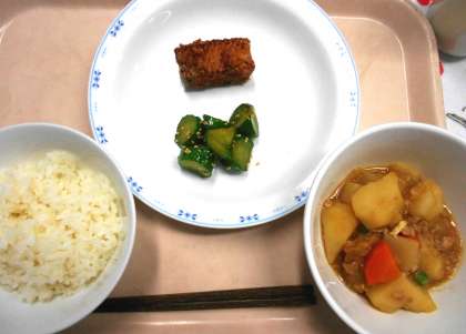 主菜の<いかのかりんとあげ>は、かみごたえのある食材であるいかに下味をつけ、片栗粉をまぶして油で揚げました。よくかんで食べ、咀嚼力の向上に努めてほしいと思います。