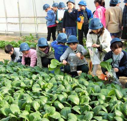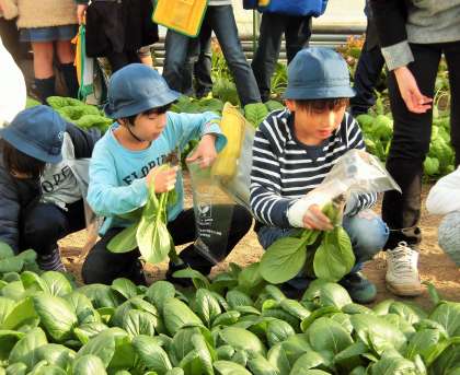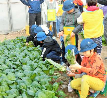 実際に小松菜を一人ひとりが収穫し、海老澤さんのご厚意でいただいてきました。自分が収穫した小松菜を見て、嬉しそうな表情を浮かべていました。