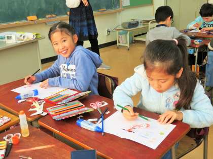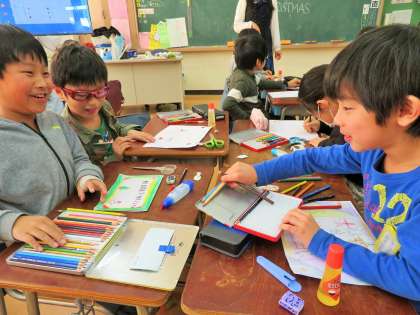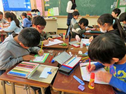 授業はすべて英語で展開されています。子どもたちは英語で、カード作りの説明を聞き、クリスマスカードの書き方も勉強しました。