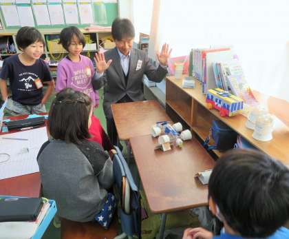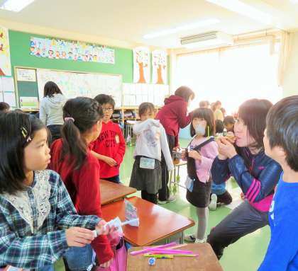 友達と動くおもちゃで遊びながら、輪ゴム、磁石、風、水、ひもなどの動くおもちゃの仕組みのおもしろさを発見したり、気付いたりしていました。先生たちもお客さんとなり一緒になって遊びました。