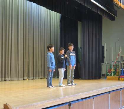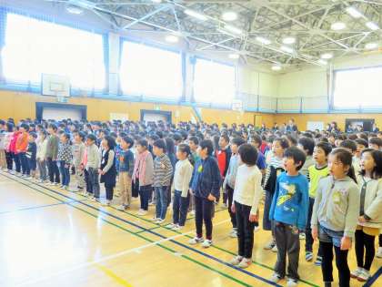 元気よく校歌を歌い、最後に、転入生の紹介を行いました。