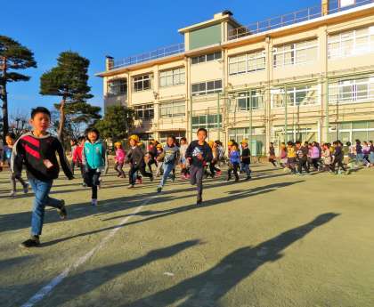 朝ランの音楽に合わせて、自分のペースでリズムよく走っている子、先生と一緒に走っている子、友達と競走をしながら走っている子など様々です。
