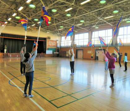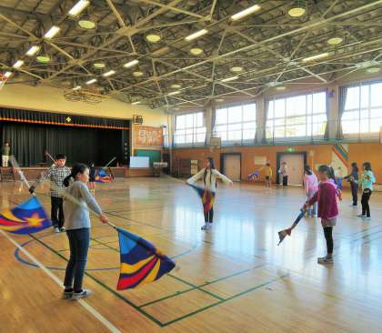 体育館でも張りつめた空気の中、フラッグとメジャーの練習に集中して取り組んでいます。