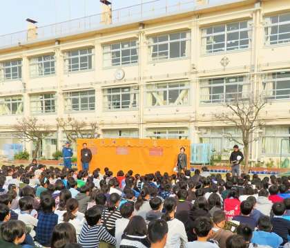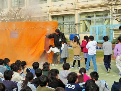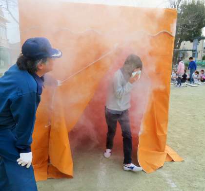 各クラスの代表児童と5年生は煙体験を行いました。煙の中はまわりが全く見えません。手探りで姿勢を低くして、歩きながら出口までなんとか歩いていました。