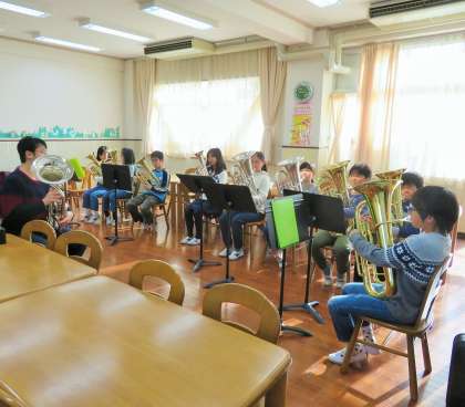 今日は5年生が、特別講師による鼓笛の講習を受けました。子どもたちは本物の音を聴きながら、音譜の読み方、正しい姿勢、音の出し方など少人数で講習を受けました。