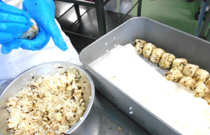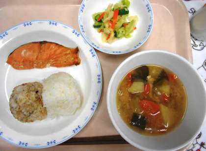 学校給食は、明治22年山形県の学校で弁当をもってこられない子どものために始まりました。今日の給食は、給食が始まった明治時代の献立<おにぎり・魚の塩焼き・漬物>を再現しました。