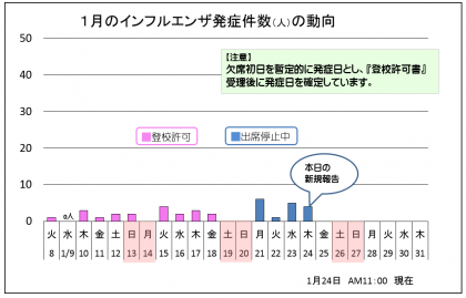 本日、1年2組においてインフルエンザ様疾患による欠席者が下記の通り急増しました。罹患児童の健康回復と感染の拡大防止のため、校医及び区教委の許可を得まして学級閉鎖の措置をとることになりました。