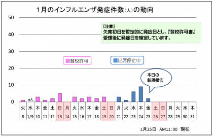 東京都では、現在まさに『インフルエンザ流行』のピークにさしかかっているようです。引き続き予防に努めるとともに、悪寒・体の痛み・頭痛等の症状がある場合の無理な登校は控えていただきまして、発熱等がある場合は必ず医療機関を受診して頂きますようお願いいたします。