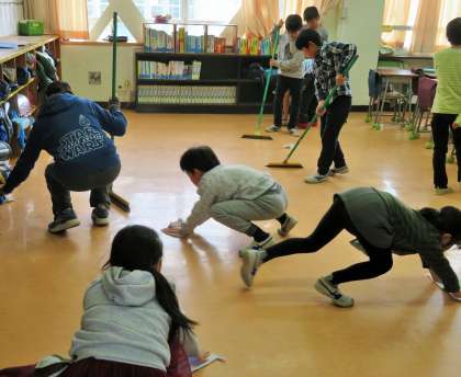 3学期も毎週金曜日は、学年の発達段階に合わせた「自問清掃」に取り組んでいます。「話をしない清掃」「無言清掃」、そして「自問清掃」へとステップアップさせていきます。