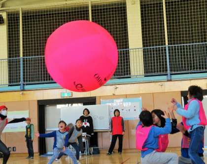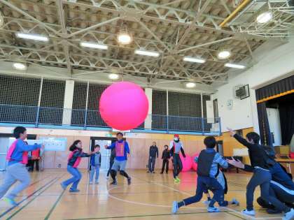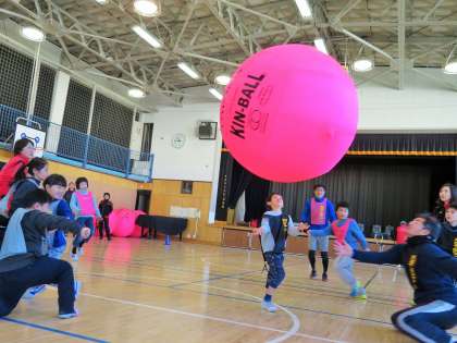 体育館では「キンボール」です。世田谷区スポーツ推進委員の方々が優しく教えてくださいました。