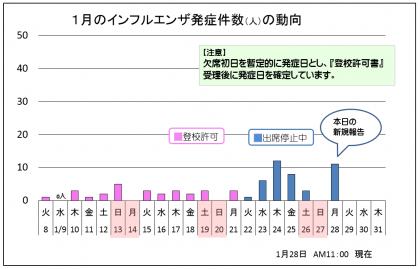 発熱で欠席の方から、医療機関受診後「インフルエンザでした」と学校に随時報告が入ります。本ホームページでは、当日の午前11時までのインフルエンザ発症件数をお知らせしています。午前11時以降の報告件数につきましては、次のホームページにてデータに反映しております。