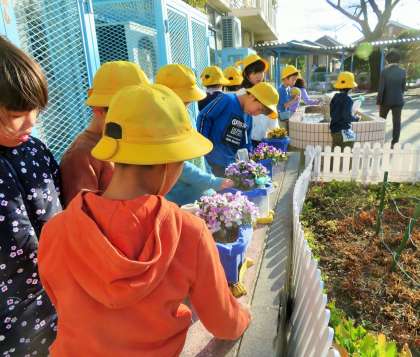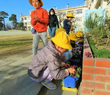 全校朝会の後に、1年生はビオラの花がら摘みをしました。秋から春までたくさんの花を咲かせるビオラ。ビオラの花をたくさん咲かせるためには、このような日々のちょっとした手入れ次第で、花数がかなり違ってくるのです。