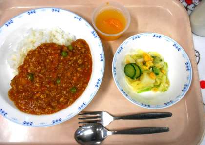 今日の給食は、<キーマカレーライス>です。キーマカレーは、ひき肉の他にみじん切りにした野菜がたくさん入ったうまみたっぷりのカレーです。今日も、どの学級もよく食べていました。