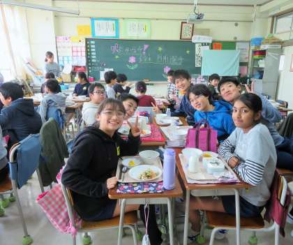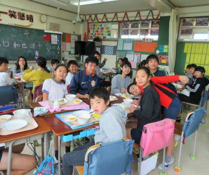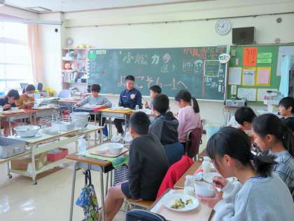 まず、各クラスに一人ずつ選手に入ってもらい、給食を一緒に食べながら駅伝にかける思いなどの話を聞いたり、質問に答えてもらったりしました。
