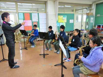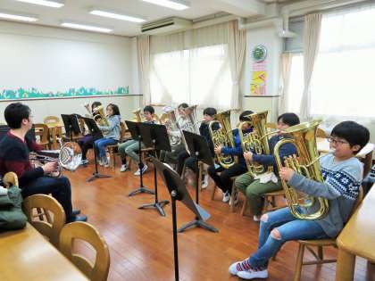 今日は5年生が、特別講師による鼓笛の講習を受けました。子どもたちは本物の音を聴きながら、音譜の読み方、音の出し方など少人数で講習を受けました。