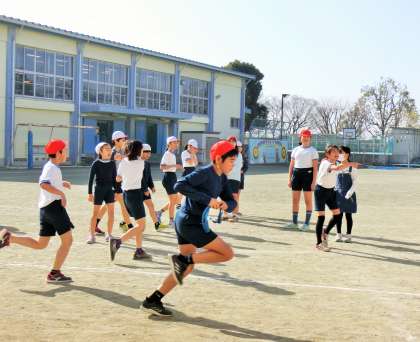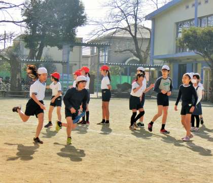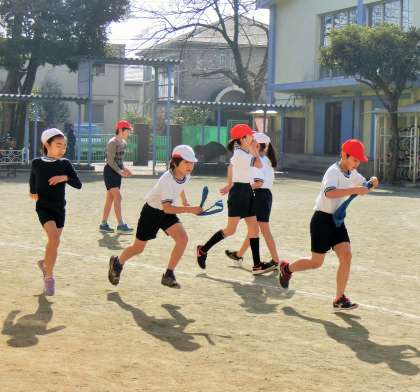 5年生は、初めての駅伝大会に向けてたすきリレーの練習をしています。朝ランニングの成果発表とともに、進級、卒業に向けてクラスの心を一つにすることをねらいとしています。