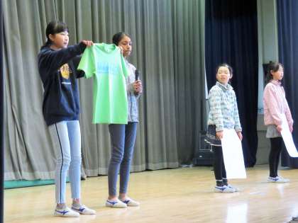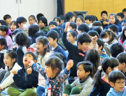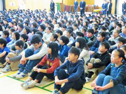 今日の児童集会は集会委員会による「6年生クイズ集会」です。6年生に関する○・×クイズです。例えば、「今年の6年生Tシャツのカラーは何色でしょうか?」等の問題が出題されました。