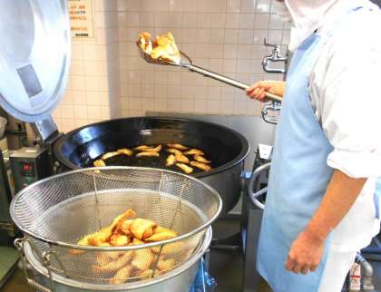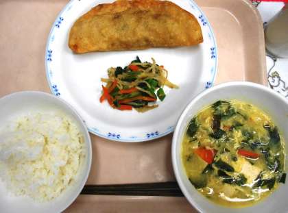 今日の主菜は、砧小の子どもたちに大人気の<ジャンボぎょうざ>です。1〜3年生は直径13cmの皮を、4〜6年生は直径15cmの皮を使って作る砧小特製ぎょうざです。「今日は、ジャンボぎょうざだ!嬉しい!」と朝から楽しみにしていてくれた子どもたちも多かったようです。作り手にとって、子どもたちのこのような言葉はとてもありがたく、明日への活力になります。