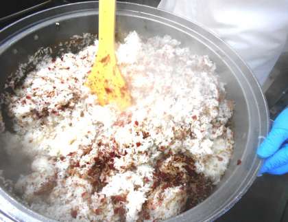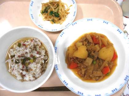 今日の主食は、6年生からのリクエストメニュー<梅茶漬け>です。梅干しやゆかり・じゃこが入ったご飯に、だしをかけていただきます。梅干しのすっぱさのもとになっているクエン酸は、体の疲れをとってくれます。梅干しのパワーで元気いっぱいになって、明日の6年生を送る会をすてきな会にしてほしいです。