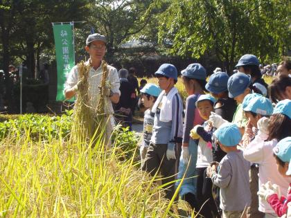 砧幼稚園の園児と次太夫堀公園に行って稲刈りをしました。秋晴れの中、気を遣いながらも楽しい時間になりました。一緒に頑張った5月の田植えを思い出しながら・・・。