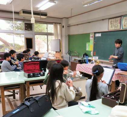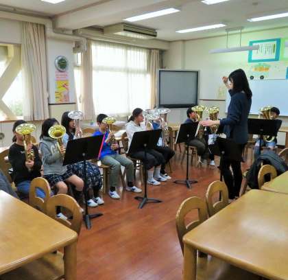 5年生が、特別講師による鼓笛の講習を受けました。子どもたちは本物の音を聴きながら、音譜の読み方、音の出し方など、少人数でパート毎に講習を受けました。