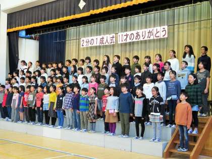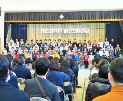 今日は、4年生が「2分の1成人式」を行いました。20歳で迎える成人式。その半分、10歳の節目をお祝いしました。子どもたちは、これまで育ててもらった感謝の気持ちや決意を言葉に表し、「10歳のありがとう」を歌いました。