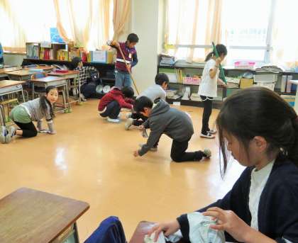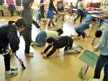 各学年の発達段階に合わせての取り組みですが、おしゃべりをしないで掃除をしている姿は、とても美しく心の成長を感じます。「がまんの心」、「見つける心」、「親切な心」を磨いています。自分たちが使用したところは自分たちでしっかりと掃除をします。