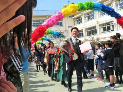 校庭に花道をつくり、みんなで6年生を送り出しました。
