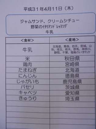 4月11日(木)の給食食材産地について
