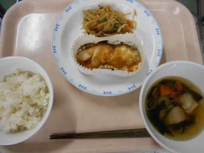 今日はこどもたちに人気の魚料理です。ホキはくせがなく、みそマヨネーズのたれとよく合います。