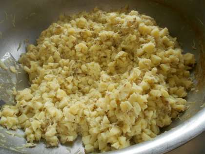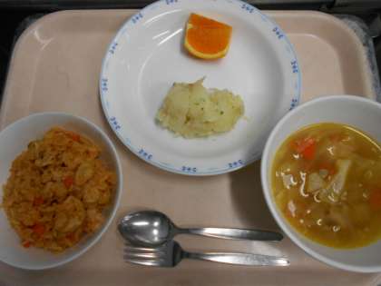 ジャーマンポテトのたまねぎは甘みが出るまで給食調理員さんが50分以上かけて、じっくり炒めてくれました。おいしいジャーマンポテトができました。