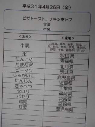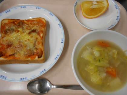 今日の給食はピザトーストと春キャベツがたっぷり入ったチキンポトフと