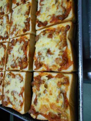 写真はピザトーストが焼きあがったところです。給食室の中が、パンの焼ける良いにおいでいっぱいでした。
