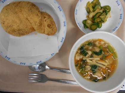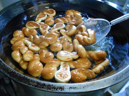 きなこ揚げパンは給食で人気のある献立のひとつです。給食室でパンを油で揚げて作っています。写真はパンを揚げているところです。