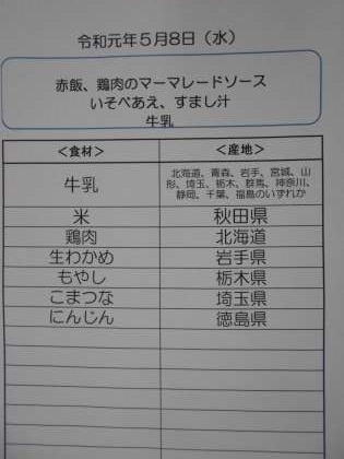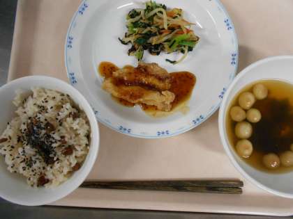 今日は開校記念日です。砧小学校は117歳になりました。開校記念日のお祝い給食として、お赤飯にしました。写真は鶏肉のマーマレードソースです。マーマレードジャムと粒マスタードを使っていて、てもおいしいソースです。