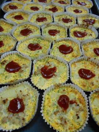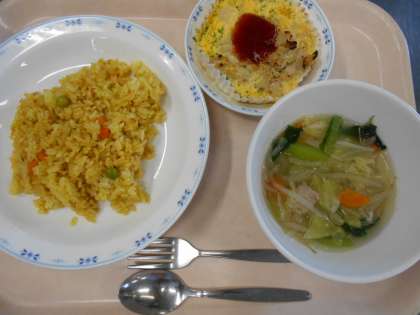 今日はスペインの料理「トルティーヤ」をイメージした「スペイン風オムレツ」です。赤ワインとトマトケチャップを合わせて加熱したソースをかけています。