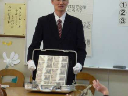 「本物なの」と聞いている子もいました。税に対するクイズや世界の消費税の違いなど楽しい時間でした。