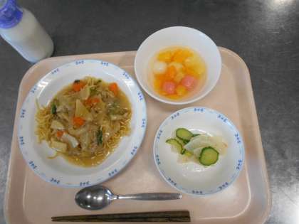 もうすぐ運動会です。運動会へ向け、今日のデザートは玉入れをイメージした赤玉白玉フルーツポンチです。