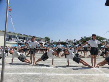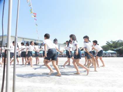 5・6年生による表現は、「SUNSHINE〜組体操2019」です。心を合わせて、1つ1つの技を決めていきました。最後に、みんなで手を繋ぎ、1つの輪になり一礼しました。そして、まるでお互いの健闘をたたえ合うかのように、順番にパチンとタッチし合いながら退場していきました。