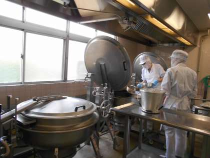 写真は家常豆腐を配缶しているところです。今日は中国四川省の家庭料理「家常豆腐」です。豆腐とたくさんの野菜を炒めてつくる栄養バランスのよいおかずです。給食では低学年と高学年で辛さを変えて作っています。高学年のほうがすこしピリッとしていて、白いごはんがすすみます。