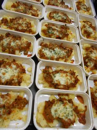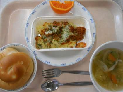 角切りにして蒸したじゃがいもの上に、豚ひき肉と玉ねぎと人参を炒めて作ったミートソースをかけ、さらに上からチーズとパセリをのせて焼きました。給食室のオーブンからはチーズの焼けるおいしいにおいがしていました。