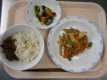 6月4日から10日まで「歯と口の健康週間」です。よくかんで食べてもらえるようにと手作りのかみかみ佃煮をつくりました。給食だよりにレシピをのせていますので、ぜひ体によい手作りふりかけを作ってみてください。写真は食材を切っているところです。
