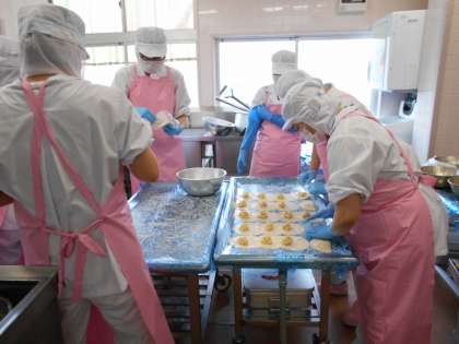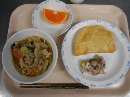 たんめんは鶏がらでとったスープに野菜がたっぷり入ったラーメンです。ツナとポテトのパリっと揚げは、じゃがいもをむしてつぶしたものに、ツナ、チーズ、しそをいれてぎょうざの皮でつつんで揚げました。写真はパリッと揚げを包んでいる様子です。